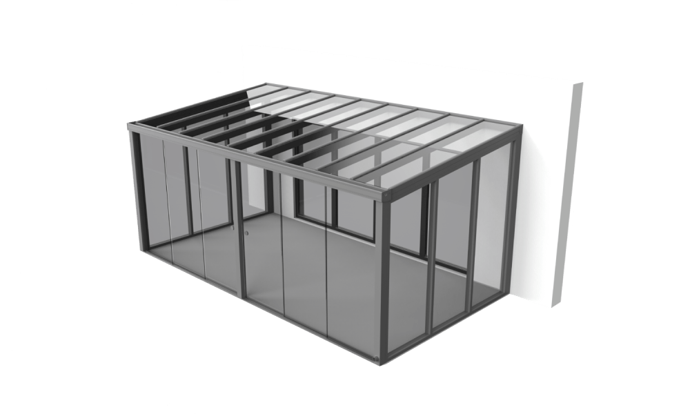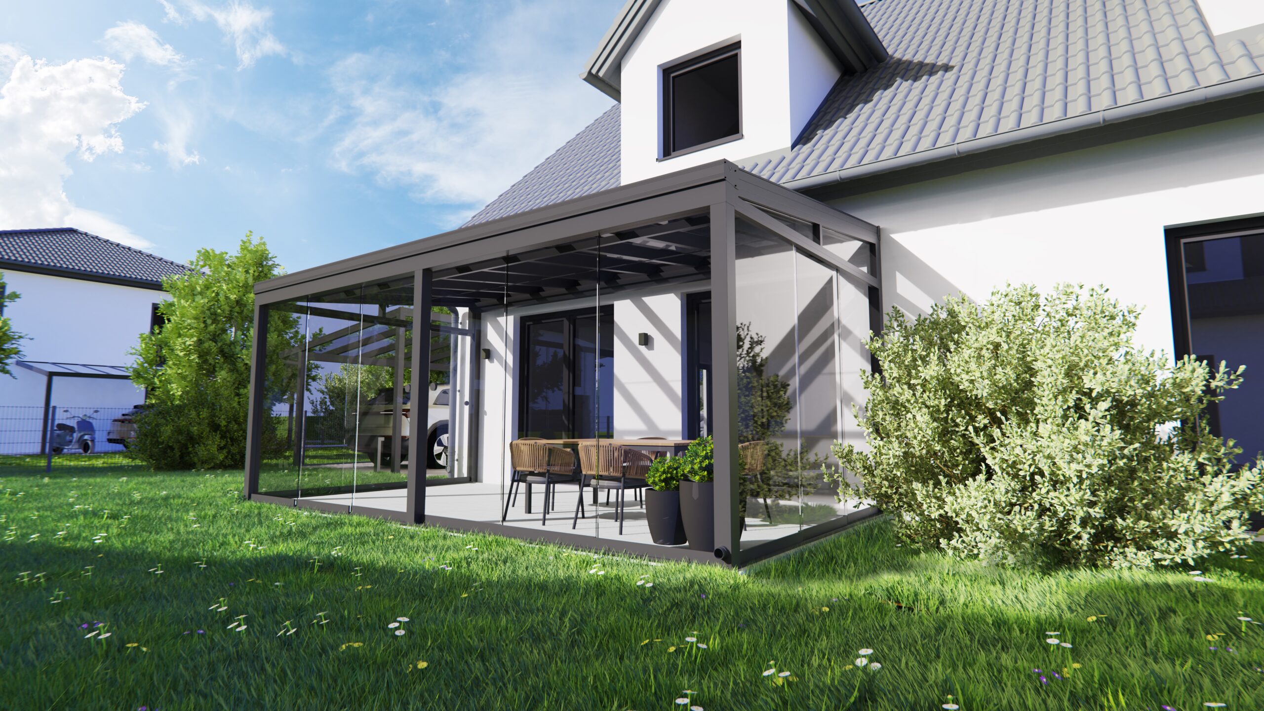Die Ganzglas-Schiebeanlage überzeugt durch maximale Transparenz: Die Glasflächen sind ohne störende Flügelrahmen gestaltet, sodass ein nahezu ungehinderter Blick nach draußen möglich ist. Im geschlossenen Zustand wirkt die Anlage besonders leicht und offen. Diese Lösung eignet sich ideal für Bereiche, in denen Design und freie Sicht im Vordergrund stehen – zum Beispiel bei modernen Terrassenüberdachungen oder Kaltwintergärten.
