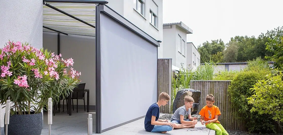 Die Fenstermarkise FenMa Zip ist eine filigrane Markise, die an senkrechten Flächen für Sonnen- und Sichtschutz sorgt. In Kombination mit einem Terrassendach oder einer Pergolamarkise bietet die FenMa optimalen Rundumschutz, da die durch einen Reißverschluss geführten Markisentücher äußerst windstabil sind und Lichteinfall verhindern.