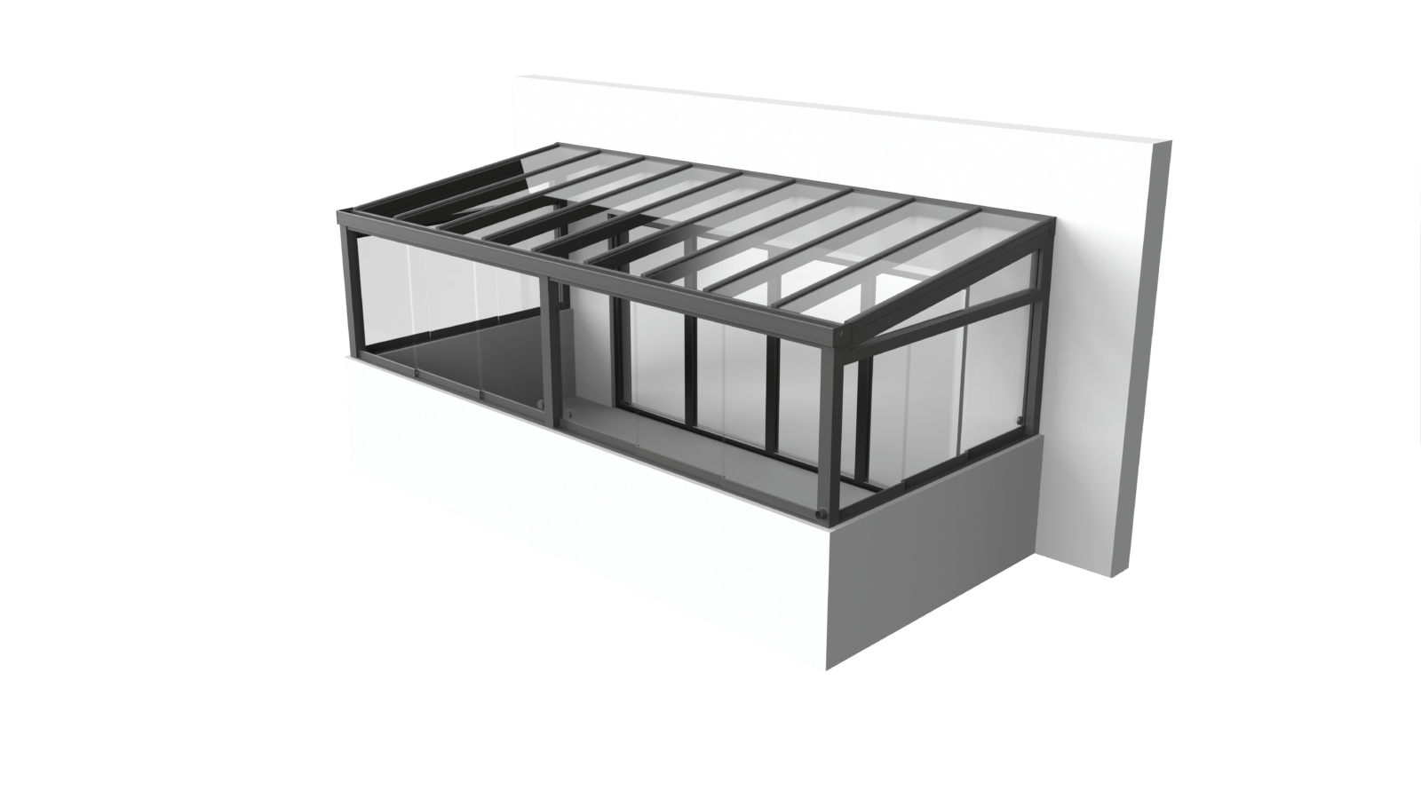Eine Balkonüberdachung mit Verglasung, die den Balkon vollständig umschließt und Schutz vor Wind und Wetter bietet, während gleichzeitig ein heller und geschützter Wohnraum im Freien entsteht.