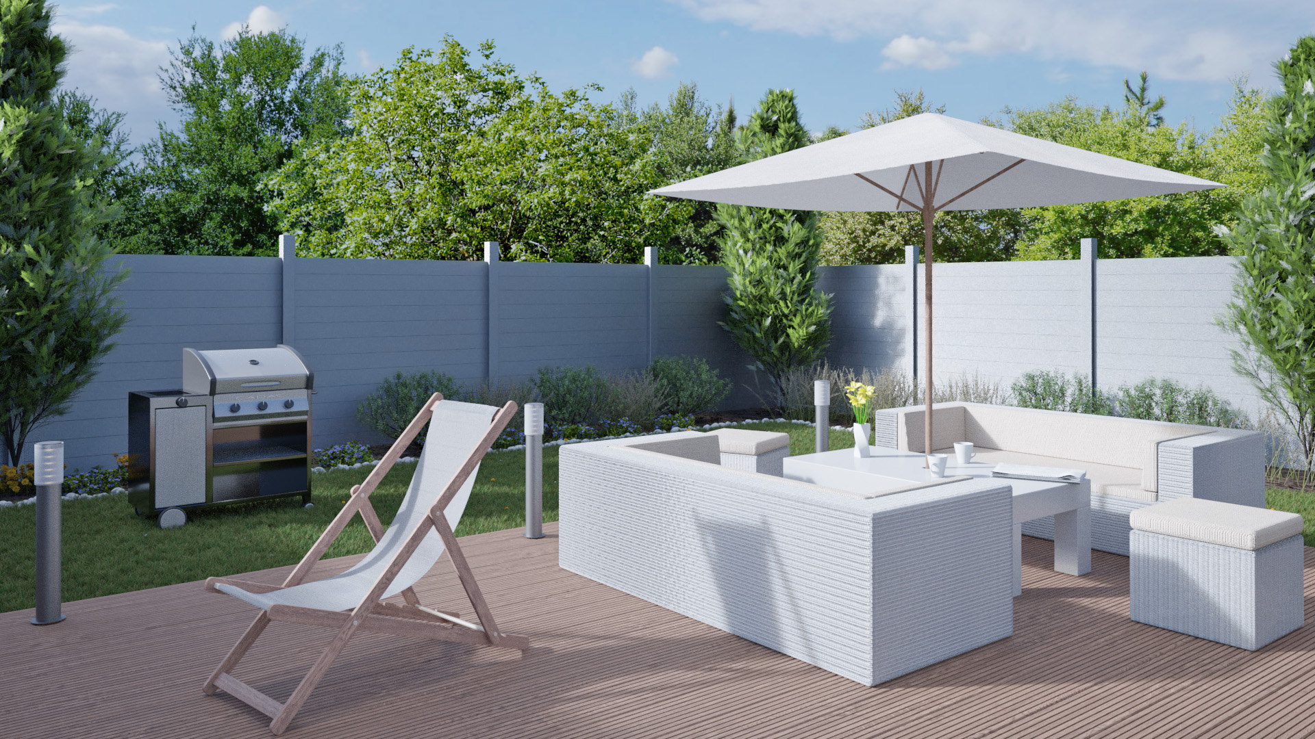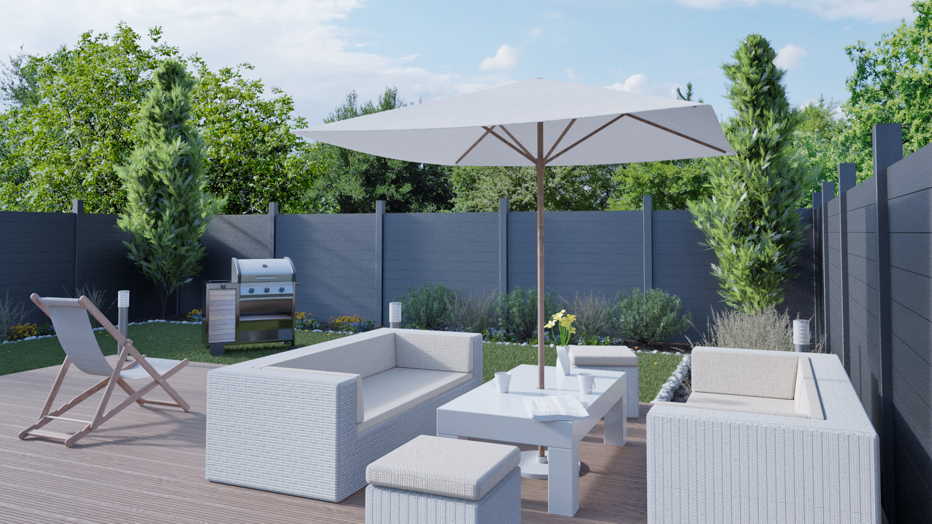 Lamellensystem, basierend auf einem vollständigen Profil mit 8 cm breiten Lamellen. Das Zaunsystem bietet ein Gefühl der Privatsphäre im Garten ohne ein erdrückendes Gefühl.